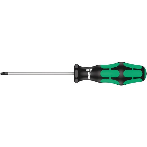 Hochwertiger Kraftform Plus Schraubendreher. Mehrkomponentiger Kraftform Griff für schnelles und schonendes Arbeiten. TORX® BO-Schrauben besitzen in ihrem Antriebsprofil einen vorstehenden Zapfen. Damit wird unerlaubtes Lösen verhindert, denn mit "normalen" TORX®-Werkzeugen können diese Schrauben nicht betätigt werden. Nur spezielle TORX® BO Werkzeuge weisen eine Bohrung auf, in die der Zapfen aufgenommen wird. Die Wera Black Point Spitze und ein aufwändiges Härteverfahren garantieren lange Nutzbarkeit der Spitze, erhöhten Korrosionsschutz und exakte Passgenauigkeit. Der Sechskantabrollschutz verhindert lästiges Wegrollen am Arbeitsplatz. Mit Griffkennzeichnung zum leichteren Finden und Sortieren des Werkzeugs.