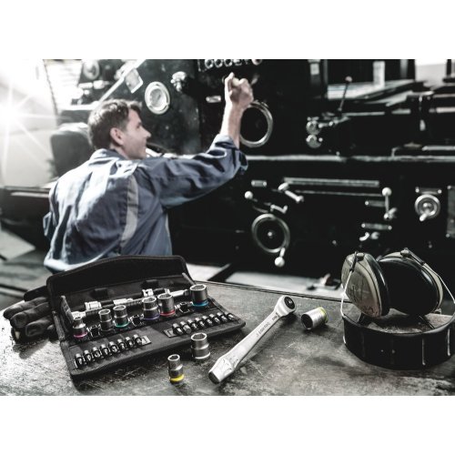 Unglaublich kompakte Satzanordnung für viel Werkzeug auf engem Raum. Völlig neues Knarrensatz-Gefühl dank neuartiger textiler Boxen mit sehr hoher Robustheit und Langlebigkeit. Aufrecht positionierbar zur übersichtlichen Lagerung im Werkstattregal. Zusätzlicher Oberflächenschutz durch textiles Außenmaterial. Geringes Gewicht und Volumen für vereinfachte Mobilität.Mit Werkzeugfinder "Take it easy": Farbkennzeichnung nach Größen.