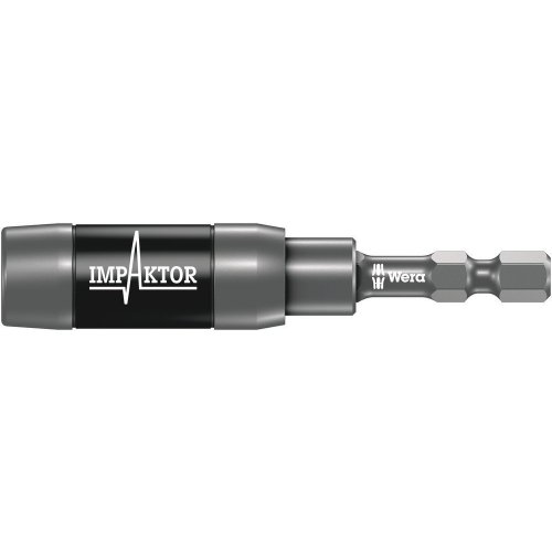 Wera Impaktor Halter zur Abfederung extremer Impulsspitzen. Besonderer Torsionseffekt durch Doppeltorsionsfeder. Der Impaktor Halter hält mit seinem Ringmagneten zusätzlich lange und schwere Schrauben bombenfest. Damit ist ein blitzschnelles und sicheres Ansetzen der Schraube möglich. Ideal auch für Über-Kopf-Arbeiten. Sollte der Magnet situationsbedingt, z.B. bei Metallarbeiten, nicht gewünscht sein, kann der aus dem Schraubbereich herausgezogen und damit ausgeschaltet werden. Einsatz vorwiegend bei manuellen Maschinenverschraubungen. Abtrieb: Geeignet für Bits mit 1/4"-Außensechskantantrieb nach DIN ISO 1173-C 6,3. Antrieb: 1/4"-Sechskant, passend für Schraubermaschinen mit Aufnahme nach DIN ISO 1173-F 6,3.
