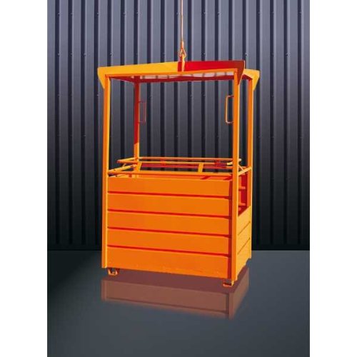Für bis zu zwei Personen und Werkzeug. Nutzlast 200 kg, Breite 890 mm, Länge 1550 mm. Die robuste Arbeitsplattform ist konstruiert mit einer extra verstärkten Riffelblech-Bodenplatte und einer schützenden Deckenplatte. Alle vier Seiten sind halbhoch mit schlagstabilen Wänden aus Stahlprofilblech und einem höchst belastbaren, umlaufenden Sicherheitsgeländer ausgestattet. Der Einstieg erfolgt über die schmale Seite. Gebaut nach den arbeitssicherheitstechnischen Bestimmungen der Berufsgenossenschaften.
