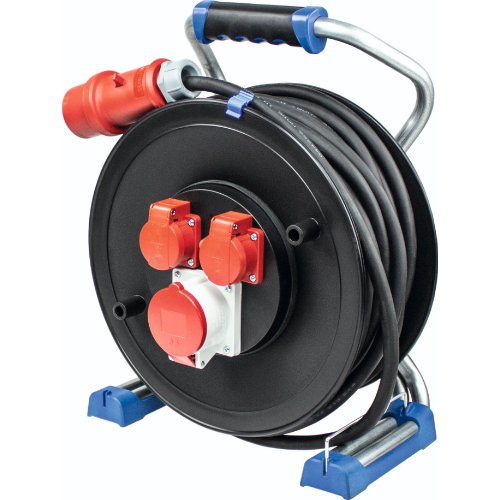 - mit 2 Schutzkontaktsteckdosen 230 V mit Sicherheitsklappdeckeln und Hammerzeichen und 1 CEE Steckdose 400 V, 16 A, 5-polig