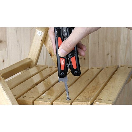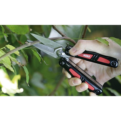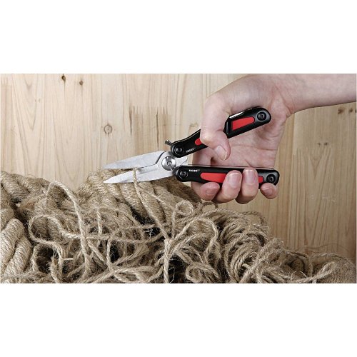 - 1 Multitool mit 7 Möglichkeiten: Schere, Messer, Säge, Feile, Kreuzschlitzschraubendreher sowie großem und kleinem Schlitzschraubendreher