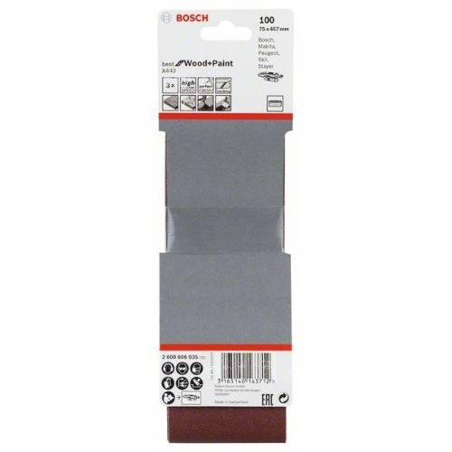 Das Schleifband X440 Best for Wood and Paint besitzt eine überragende Materialabtragsrate beim Schleifen von alter Farbe, Lack oder Holzflächen. Die harten Halbedelkorundkörner gestatten Schleifen mit hoher Abtragsleistung. Die Unterlage besteht aus X-Gewebe und weist eine hochwertige Bandverbindung auf – für hohe Belastbarkeit bei aufwendigen Arbeiten. Die elektrostatisch offen gestreuten Schleifkörner gestatten eine gleichmäßige Staubabsaugung für kontinuierliches Schleifen. Dieses Produkt ist geeignet für das Schleifen von Oberflächen aus Holz und mit Beschichtung sowie für das Entgraten scharfen Kanten. Es ist auch ideal für das Bündigschleifen von Rändern und Falzen. Die Vollkunstharzklebung der Schleifkörner sorgt für Verschleißfestigkeit bei hartem Einsatz.