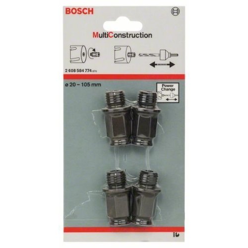 Das vierteilige Verlängerungsadapter-Set ermöglicht schnelles Wechseln von Lochsägen des Typs Multi Construction LS und leichtes Entfernen des Bohrkerns. Für Kompatibilität mit dem Bosch Quick Change-Adapter lassen sich die Verlängerungsadapter ganz einfach in das Gewinde von Lochsägen des Typs Multi Construction schrauben. Es ist für Akku- und Netzbohrschrauber geeignet. Das Set enthält 4 Adapter für Lochsägendurchmesser von 20 bis 105 mm