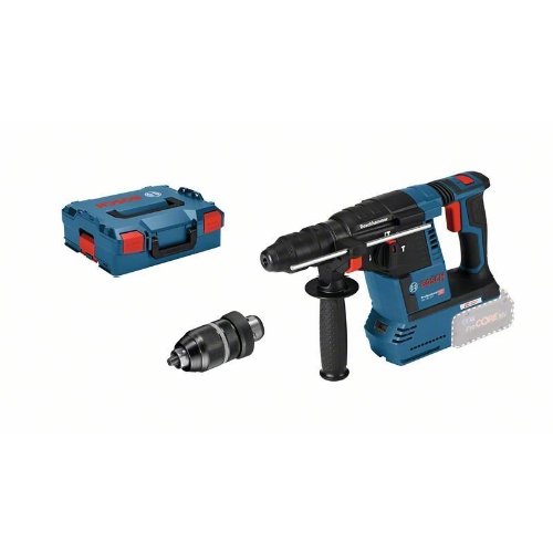 Akku-Bohrhammer mit SDS plus GBH 18V-26 F, Der GBH 18V-26 F Professional mit Schnellspannbohrfutter ist der Allrounder im Bosch SDS plus Akku-Bohrhammer Segment und damit ideal für den täglichen Einsatz. Die zusätzliche Staubabsaugung GDE 18V-16 Professional kann mit dem Bohrhammer kombiniert werden und bietet eine in sich geschlossene HEPA-Staublösung für maximale Mobilität. Der Bohrhammer verfügt außerdem über KickBack Control und Electronic Precision Control (EPC) für eine bessere Handhabung und erhöhten Anwenderschutz. Sein leistungsstarker Motor liefert 2,6 Joule Schlagenergie und eine hohe Abtragsleistung. Dieses Elektrowerkzeug eignet sich zum Bohren und Meißeln in Beton, Mauerwerk, Holz und Metall. Es ist kompatibel mit verschiedenen Systemzubehören zur Staubabsaugung und mit allen Bosch Professional 18V-Akkus und -Ladegeräten (Professional 18V System). Außerdem verfügt der GBH 18V-26 F Professional über verschiedene Zusatzfunktionen wie Constant Speed, einen bürstenlosen Motor, Electronic Motor Protection (EMP) sowie ein LED-Licht, Überlastkupplung, variable Drehzahl, Vario Lock und Vibration Control. L-BOXX 136 (1 600 A01 2G0); Zusatzhandgriff (2 602 025 141); Tiefenanschlag 210 mm (1 613 001 010); Maschinentuch (ET-Nr. 1 619 200 413); Wechselfutter SDS plus (2 608 572 213); Schnellwechselbohrfutter 13 mm (2 608 572 212); 1/1 L-BOXX-Einlage für Gerät (1 600 A00 HP1)