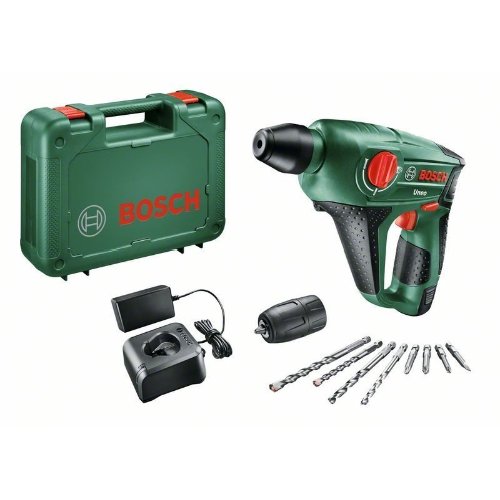 Akku-Bohrhammer Uneo. Das vielseitige 3-in-1-Akku-Werkzeug zum Bohren, Hämmern und Schrauben. Pneumatisches Hammerwerk für leichtes und schnelles Bohren, sogar in Beton. SDS quick-Schnellspannbohrfutter für einen einfachen, intuitiven und zügigen Zubehörwechsel in nur 3 Sekunden. Zweiganggetriebe sorgt je nach Anwendung für eine höhere Drehzahl oder ein höheres Drehmoment. Hämmern, Bohren und Schrauben in Beton, Mauerwerk, Fliesen, Holz und Metall. POWER FOR ALL – geringes Gewicht von 1,2 kg und austauschbarer 12-V-Akku. POWER FOR ALL: Ein Akku und ein Ladegerät für das komplette Home & Garden Gerätesystem. Im Lieferumfang enthalten: 1 Akkupack PBA 12V 2.5Ah O-B, Rundschaftadapter, Betonbohrer Ø 6 und 8 mm, Universalbohrer Ø 5 und 6 mm, 4 lange Bits, Ladegerät GAL 12V-20, Koffer