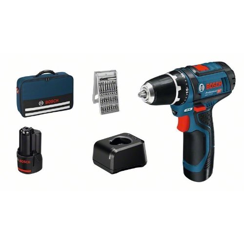 Akku-Bohrschrauber GSR 12V-15, Der Akku-Bohrschrauber GSR 12V-15 Professional bietet in der 12-Volt-Klasse von Bosch ein ausgewogenes Verhältnis zwischen Leistung und Größe. Sein hartes Drehmoment von 30 Nm und 0-1.300 U/min sorgen für das beste Verhältnis zwischen Größe und Leistung. Sein kompaktes Design ermöglicht optimales Handling und ist ideal zum Arbeiten über Kopf und an engen Stellen. Überlastung, Überhitzung und Tiefentladung werden durch die Electronic Cell Protection des Bohrschraubers verhindert. Dieses Elektrowerkzeug wurde zum Bohren in Holz mit einem maximalen Durchmesser von 19 mm, in Stahl bis 10 mm und für Schraubdurchmesser bis 7 mm konzipiert. Das Gerät ist mit allen Bosch Professional 12-Volt-Akkus und -Ladegeräten kompatibel (Professional 12V System). Der GSR 12V-15 Professional verfügt außerdem über 2 Gänge, Autolock, Ladezustandsanzeige, Electronic Motor Protection und Lithium-Ionen-Technologie. 2 x Akku GBA 12V 2.0Ah (1 600 Z00 02X); Ladegerät GAL 12V-20 Professional; Bit-Set 25-tlg.; Bosch Professional Werkzeugtasche 12V (1 600 A00 3BG)