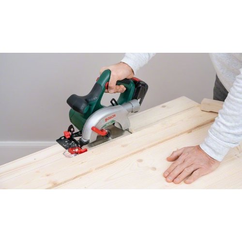 Akku-Kreissäge PKS 18 LI. Kabellose Freiheit für vielseitige Geradschnitte. Parallelanschlag bietet Unterstützung bei Geradschnitten in Holzwerkstoffen. Einfache und schnelle Einstellung von Schnitttiefe und Winkel. Verwendung ohne Stromkabel an jeder Arbeitsstätte, auch ohne Zugang zum Netzanschluss. CutControl bietet zusätzliche Präzision beim Folgen der geraden Schnittlinie. Syneon Technology steuert den Energieverbrauch für optimale Effizienz und längere Laufzeit. POWER FOR ALL: Ein Akku und ein Ladegerät für das komplette Home & Garden-Gerätesystem. Im Lieferumfang enthalten: Sägeblatt (2 609 256 D62), Parallelanschlag (1 619 X08 284), Kartonschachtel