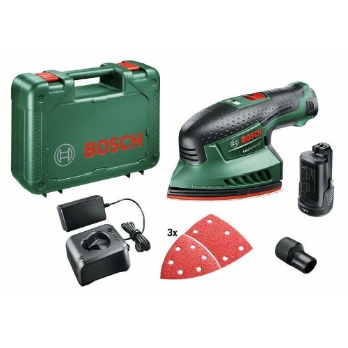 Akku-Multischleifer EasySander 12. Kompakt und kabellos für geläufige Schleifarbeiten und Reparaturen, Kompaktes, ergonomisches Design für eine leichte Bewältigung von Schleifarbeiten in Ecken, an Kanten und an kleineren flachen Oberflächen. PowerAutomatic erhöht automatisch die Leistung, wenn mehr Druck ausgeübt wird. Klettverschlusssystem ermöglicht einfache Schleifpapierwechsel. Adapter für den Anschluss an einen Staubsauger zur Staubabsaugung. Verwendung für Hartholz, Weichholz, gestrichene und lackierte Oberflächen. POWER FOR ALL: Ein Akku und ein Ladegerät für das komplette Home & Garden-Gerätesystem. Syneon Technology steuert den Energieverbrauch für optimale Effizienz und längere Laufzeit. Im Lieferumfang enthalten: 2 Akkupacks PBA 12V 2.5Ah O-B, Adapter für Staubsauger, 3 Schleifblätter K 80, K 120, K 160 (2 609 000 178), Ladegerät GAL 12V-20, Tragekoffer