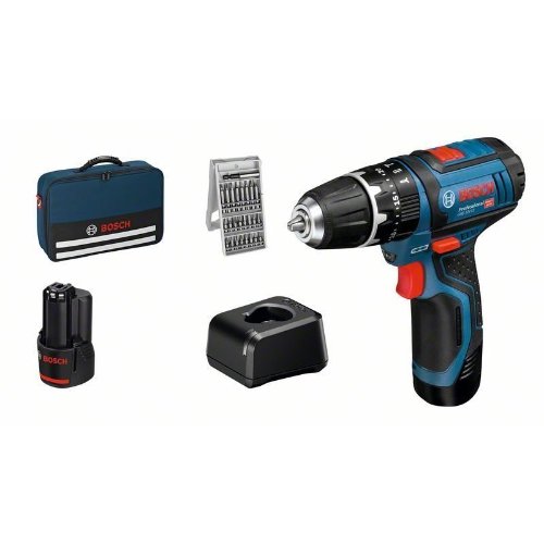 Akku-Schlagbohrschrauber GSB 12V-15, Der Akku-Bohrschrauber GSB 12V-15 Professional mit Schlagbohrfunktion bietet in der 12-Volt-Klasse von Bosch ein ausgewogenes Verhältnis zwischen Leistung und Größe. Mit einem harten Drehmoment von 30 Nm und 0-1.300 U/min bietet der Bohrschrauber eine ideale Kombination aus Leistung und geringer Größe. Sein kompaktes Design ermöglicht optimales Handling und ist ideal zum Arbeiten über Kopf und an engen Stellen. Überlastung, Überhitzung und Tiefentladung werden durch die Electronic Cell Protection des Bohrschraubers verhindert. Die Schlagbohrfunktion dieses Elektrowerkzeugs wurde zum Bohren in Holz mit einem maximalen Durchmesser von 19 mm, in Stahl und Mauerwerk bis 10 mm und für Schraubdurchmesser bis 7 mm konzipiert. Das Gerät ist mit allen Bosch Professional 12-Volt-Akkus und -Ladegeräten kompatibel (Professional 12V System). Der GSB 12V-15 Professional verfügt außerdem über 2 Gänge, Autolock, Ladezustandsanzeige, Electronic Motor Protection und Lithium-Ionen-Technologie. 2 x Akku GBA 12V 2.0Ah (1 600 Z00 02X); Ladegerät GAL 12V-20 Professional; Bit-Set 25-tlg.; Bosch Professional Werkzeugtasche 12V (1 600 A00 3BG)