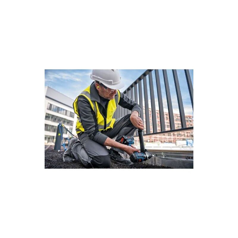 Akku-Schlagbohrschrauber GSB 18V-150 C, Der GSB 18V-150 C Professional ist ein cleverer Schlagbohrschrauber mit einzigartiger Kraft und Kontrolle für leichtes, flexibles Arbeiten. Er eignet sich perfekt zum Schrauben, Bohren und Schlagbohren und ermöglicht extrem schnellen Arbeitsfortschritt dank außergewöhnlich leistungsstarker ProCORE18V-Akkus und eines bürstenlosen Motors mit BITURBO-Technologie bei einem maximalen Drehmoment von 150 Nm. Seine raffinierte Electronic Angle Detection gewährleistet bei langen Schrauben immer den richtigen Winkel, und seine zuschaltbare KickBack Control für die Arbeit mit Lochsägen verringert das Risiko plötzlicher Rotation um die Achse, wenn das Werkzeug verklemmt. Dank Metallbohrfutter und Metallgetriebe ist der Schlagbohrschrauber jederzeit extrem zuverlässig und robust, wenn es wirklich darauf ankommt. Er ist die ideale Wahl zum Schrauben, Bohren und Schlagbohren in verschiedenen Materialien wie Holz, Metall und Mauerwerk. Der Bohrschrauber ist kompatibel mit allen Bosch Professional 18V-Akkus und -Ladegeräten (Professional 18V System); für maximale Leistung ProCORE18V ≥ 5,5 Ah verwenden. Zusatzhandgriff (1 602 025 07Y); Karton