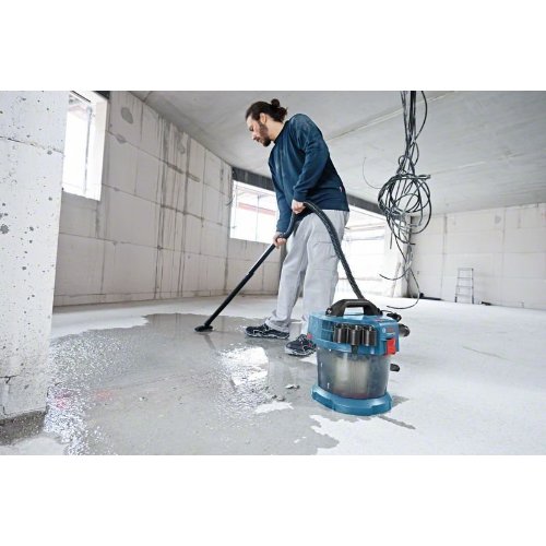 Akku-Staubsauger GAS 18V-10 L, Der GAS 18V-10L Professional ist Boschs 18-Volt-Akku-Staubsauger der Staubklasse L mit voller Saugkraft. Seine Rotationsluftstromtechnologie verhindert Filterverstopfungen und sorgt damit für anhaltende, ununterbrochene Saugleistung. Das geringe Gewicht und die kompakte Bauform des Saugers ermöglicht einen einfachen Transport und eine problemlose Aufbewahrung. Dank seines Designs ohne Staubsack und seiner zahlreichen Zubehöre (inklusive) eignet er sich ideal für verschiedene Nass- und Trockenanwendungen. Das Gerät ist kompatibel mit dem Bosch Click & Clean System und allen Bosch Professional 18-Volt-Akkus und -Ladegeräten (Professional 18V System). Der GAS 18V-10L Professional verfügt über einen HEPA-Filter und entspricht der EU-Norm der Staubklasse L. 1 x Schlauch, 1,6 m (2 608 000 658); 1 x Krümmerrohr (2 608 000 659); 3tlg. Saugrohr-Set (2 608 000 660); 1 x Fugendüse, 250 mm (2 608 000 661); 1 x Flachfaltenfilter (2 608 000 663); 1 x Bodendüse (2 608 000 707); 1 x Elektrowerkzeugadapter (2 608 000 708); 1 x Schultergurt (2 608 000 706); 4-tlg. Rollen-Set (2 608 000 705); Karton