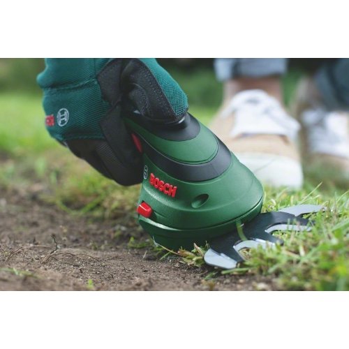 Akku-Strauch- und -Grasscheren-Set Isio. Der unentbehrliche Helfer im Garten. Kompaktes Handwerkzeug, perfekt zum Formen von Büschen und Sträuchern. Leichtes und ergonomisches Design für Komfort und müheloses Schneiden. Langlebiger 3,6-V-Lithium-Ionen-Akku ist jederzeit einsatzbereit mit bis zu 50 Minuten Laufzeit. Leistungsstarker Antrieb und Anti-Blockier-System für eine nahezu blockierfreie Extra-Schnittleistung. Im Lieferumfang enthalten: Multi-Click-Grasscherblatt 8 cm (F 016 800 326), Multi-Click-Strauchscherenmesser 12 cm (F 016 800 327), Ladegerät, Karton