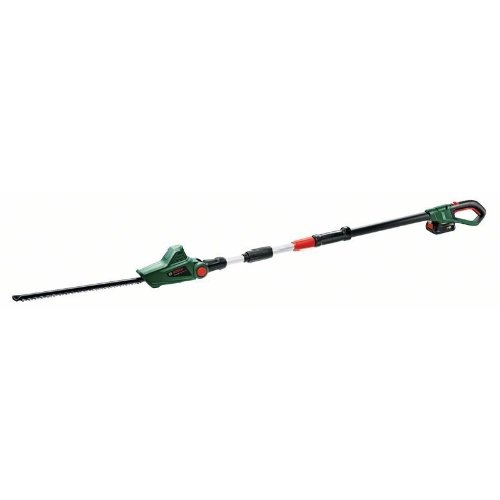 Akku-Teleskop-Heckenschere UniversalHedgePole 18. Ergonomisch geformt zum mühelosen Trimmen hoher Hecken. Höhenverstellbarer Teleskopstiel mit Schwenkkopf für eine bequeme Reichweite von bis zu 2,6 m. Bosch Anti-Blockier-System für eine kraftvolle und kontinuierliche Schnittleistung. Geringes Gewicht (3,6 kg), ergonomisches Design und gute Gewichtsverteilung für höheren Komfort. Perfekte Leistung und Reichweite für müheloses Trimmen hoher Hecken, 43 cm Messerlänge mit 16 mm Zahnabstand. Im Lieferumfang enthalten: 1 Akkupack PBA 18 V 2,5 Ah W-B, Ladegerät AL 1830 CV (1 600 A00 5B3), Karton