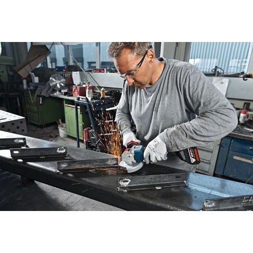 Akku-Winkelschleifer mit X-LOCK GWX 18V-10 PC, Der kleine Akku-Winkelschleifer GWX 18V-10 PC Professional mit X-LOCK bietet verbesserte Leistungsfähigkeit und Werkzeugführung in der 18V-Kategorie. Er bietet dank des bürstenlosen Motors und der ProCORE18V-Akkutechnologie dieselbe Leistung wie ein kabelgebundener Schleifer mit 1.000 Watt. Er wird mit einem schlüssellosen X-LOCK-Klick-System ausgeliefert, das einen schnellen und bequemen Zubehörwechsel ermöglicht. Darüber hinaus verfügt er über einen PROtection-Schalter, KickBack Control und X-Brake, wodurch maximaler Anwenderschutz und Komfort sichergestellt sind. Dieses Werkzeug ist für das Schneiden und Abschleifen von Metall, Stein und Beton konzipiert. Es ist kompatibel mit den Staubabsaugvorrichtungen GDE 125 EA-T Professional und GDE 115 / 125 FC-T Professional, dem Bluetooth-Modul GCY 30-4 sowie mit allen Bosch Professional 18V-Akkus und -Ladegeräten (Professional 18V System). Ferner verfügt der GWX 18V-10 PC Professional zusätzlich über ein optionales Bluetooth Connectivity-Modul, eine Schutzhaube und über einen Vibration Control-Haltegriff. Schutzhaube (1 605 510 365); Zusatzhandgriff Vibration Control (2 602 025 171); 1/1 L-BOXX-Einlage für Gerät und Ladegerät (1 600 A01 166); L-BOXX 136 (1 600 A01 2G0)