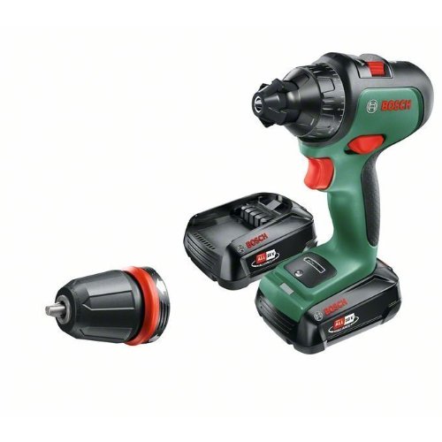 Akku-Zweigang-Bohrschrauber AdvancedDrill 18. Bohrschrauber mit einfachster Bedienung und großer Vielseitigkeit. Intuitive Auswahlmodi sowie automatische Gangwechsel passen für jede Anwendung. Das Schaltsystem bietet einen Richtungswechsel mit nur einem Klick. Richtungsanzeige mit LED-Licht. Einfach zwischen Magnetkappe zum Schrauben und Bohrfutter zum Bohren wechseln. Kraftvoll, kompakt und langlebig dank bürstenlosem Motor. Zum Schrauben und Bohren in Holz, Kunststoff und Metall. Als optionales Zubehör: Winkel-Aufsatz und Exzenter-Aufsatz für alle Montagearbeiten an engen und schwer zugänglichen Stellen. POWER FOR ALL: Ein Akku für das komplette Home & Garden Gerätesystem. Im Lieferumfang enthalten: 2 Akkupacks PBA 18V 2.5Ah W-B, Aufnahmeschaft für Bohrfutter, Schrauberbit, Ladegerät AL 1830 CV (1 600 A00 5B3), Tragekoffer
