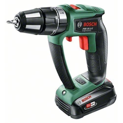 Akku-Zweigang-Schlagbohrschrauber Lithium-Ionen PSB 18 LI-2 Ergonomic. Ergonomisch, kompakt, leicht aber stark. Kompaktes, ergonomisches Design dank bürstenloser Motorentechnologie. Perfekte Kontrolle über das Gerät dank innovativer KickBack Control-Technologie – erkennt ein plötzliches Blockieren und schaltet das Gerät ab. Syneon Technology – intelligent gesteuerte Energie für jedes Projekt. 20 Drehmomentstufen, Bohrstufe. 2 Gänge mit innovativem Vor-/Rückwärts-Schalter zum Bohren/Schrauben, Schlagfunktion separat zuschaltbar. Ein Akku für alle – passend für alle Heimwerker- und Gartengeräte der POWER FOR ALL Lithium-Ionen-Akkusysteme. Schnellladegerät: 2,5-Ah-Akku einsatzbereit nach 40 min (Ladestand 80 %) – für alle Heimwerker- und Gartengeräte des POWER FOR ALL 18-Volt-Systems von Bosch. Im Lieferumfang enthalten: 1x Akkupack PBA 18 V 2,5 Ah W-B, Doppelschrauberbit, Ladegerät AL 1830 CV (1 600 A00 5B3), Kunststoffkoffer