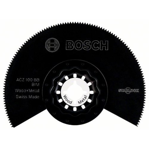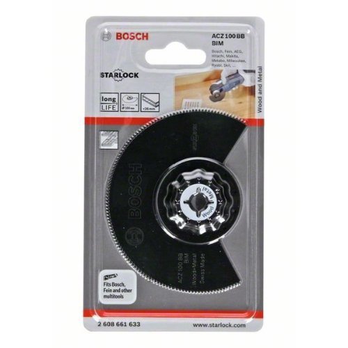 Das Segmentsägeblatt Starlock ACZ 100 BB ermöglicht breite und tiefe bündige Schnitte in Holz, Metall und Kunststoff. Der besonders große Blattdurchmesser von 100 mm ermöglicht breite Schnitte in Türrahmen und kleinere Profile sowie lange Schnitte in Bodenhöhe. Die mit der patentierten Rundschweißtechnologie von Bosch hergestellten Zähne fertigen breite Schnitte ohne Verklemmen oder Hitzeverfärbungen an. Mit dieser exklusiven Technologie wird ein breiterer Streifen aus HSS-Stahl (Schnellarbeitsstahl) auf einen schmaleren Grundkörper aus HCS-Stahl (Stahl mit hohem Kohlenstoffgehalt) geschweißt. Das Ergebnis sind freistehende, harte Zähne. Beim Schneiden von ungehärtetem Metall und abrasivem Material ist die Bimetallverbindung aus Blatt aus HCS-Stahl (Stahl mit hohem Kohlenstoffgehalt) und Zähnen aus HSS-Stahl (Schnellarbeitsstahl) verschleiß- und hitzeresistent und verleiht dem Blatt eine hohe Lebensdauer. Auch lassen sich mit den Sägeblattspitzen schwer zugängliche Ecken erreichen. Das Starlock-Aufnahmesystem ermöglicht einen schnellen Blattwechsel ohne Blattberührung in drei Sekunden. Das Aufnahmesystem ermöglicht durch seine dreidimensionale enge Passung maximale Kraftübertragung zwischen Maschine und Zubehör.