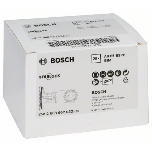 Das Tauchsägeblatt Starlock AII 65 BSPB hat bei breiten Schnitten in Hartholz eine hohe Lebensdauer. Die robuste Bimetallverbindung aus Blatt aus HCS-Stahl (Stahl mit hohem Kohlenstoffgehalt) und Zähnen aus HSS-Stahl (Schnellarbeitsstahl) ist verschleiß- und hitzeresistent. Die japanische Anordnung der scharfgeschliffenen Zähne an der Blattkante ist ideal für Hartholz geeignet. Diese dreidimensionale Zahnanordnung minimiert die Wärmeentwicklung beim Sägen, verhindert Überhitzung und erhöht die Nutzungsdauer. Die abgerundete Blattspitze (Curved-Tec) minimiert Zahnbruch und erhöht somit die Haltbarkeit des Produkts. Es wird verwendet für das Tauchsägen in laminierte Paneele oder Hartholz, das Sägen von Aussparungen in Möbelbauteile und das bündige Ablängen von Holzbauteilen. Das Starlock-Aufnahmesystem ermöglicht einen schnellen Blattwechsel ohne Blattberührung in drei Sekunden. Das Aufnahmesystem ermöglicht durch seine dreidimensionale enge Passung maximale Kraftübertragung zwischen Maschine und Zubehör.