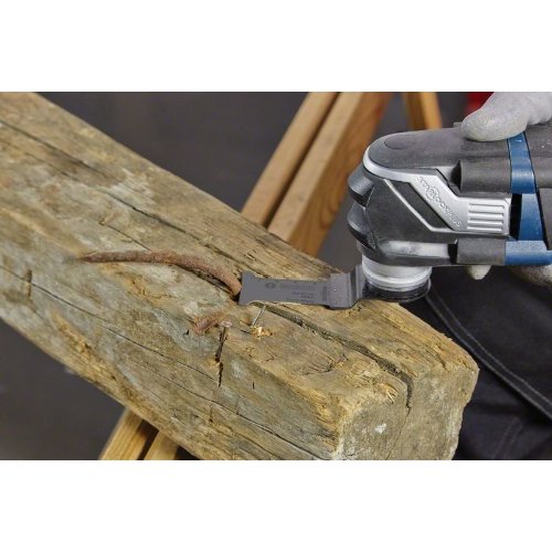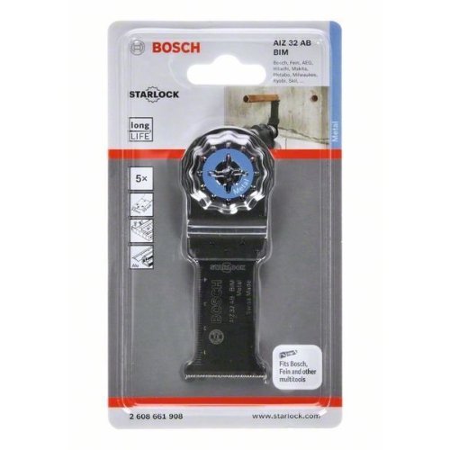 Das Tauchsägeblatt Starlock AIZ 32 AB hat bei Schnitten in ungehärtetem Metall eine hohe Lebensdauer. Die robuste Bimetallverbindung aus Blatt aus HCS-Stahl (Stahl mit hohem Kohlenstoffgehalt) und Zähnen aus HSS-Stahl (Schnellarbeitsstahl) ist bei hartem oder abrasivem Material verschleiß- und hitzeresistent. Sein zur Basis hin verjüngtes Blatt minimiert Verklemmen, transportiert Material schnell ab minimiert somit den Blattverschleiß. Das robuste Aufnahmesystem des AIZ 32 AB reduziert Lateralschwingung und ermöglicht mittels direkter Kraftübertragung präzise Schnitte bei verlängerter Nutzungsdauer. Dieses Produkt wird verwendet für das bündige Ablängen von Nägeln und Kupferrohren sowie Tauchschnitte in Gipskartonplatten. Das Starlock-Aufnahmesystem ermöglicht einen schnellen Blattwechsel ohne Blattberührung in drei Sekunden. Das Aufnahmesystem ermöglicht durch seine dreidimensionale enge Passung maximale Kraftübertragung zwischen Maschine und Zubehör.