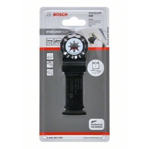 Das Tauchsägeblatt PAIZ 32 APB ermöglicht tiefe Schnitte in Holz und ungehärtetes Metall. Seine Länge von 60 mm erhöht die Reichweite für ausgedehnte Schnitte. Das robuste Starlock-Aufnahmesystem und die direkte Kraftübertragung reduzieren Lateralschwingung und ermöglichen präzisere Schnitte. Wegen dieses Merkmals ist dieses Produkt ideal geeignet für tiefe Tauchschnitte in Holz, abrasives Material und Kunststoff. Es ist gleichfalls ideal geeignet für erweiterte Tauchschnitte in Rohre aus Nichteisenmetall, Profile kleinerer Abmessungen, ungehärtete Nägel und Schrauben sowie Stahlprofile kleinerer Abmessungen. Dieses Blatt sägt Holz, ungehärtetes Metall, Kunststoff, Paneele mit Kunststofflaminierung und Gipskartonplatten. Die abgerundete Blattspitze (Curved-Tec) erleichtert das Anfertigen präziser und glatter Tauchschnitte Das System Starlock Plus ermöglicht sehr schnelle, tiefe und vielfältige Tauchschnitte. Zusätzlich ermöglicht das Starlock-Aufnahmesystem schnellen Blattwechsel in drei Sekunden ohne Blattberührung. Das spezielle Starlock-Aufnahmesystem ermöglicht durch seine dreidimensionale enge Passung maximale Kraftübertragung zwischen Maschine und Zubehör.