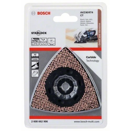 Die Schleifplatte Starlock AVZ 90 RT4 Carbide RIFF bietet besonders hohe Lebensdauer beim Entfernen von Mörtel und Fliesenkleber. Die Platte ist für hohe Verschleißfestigkeit und somit außergewöhnlich lange Nutzungsdauer mit hochwertigem Carbide-Korn der Körnung 40 besetzt. Der offene Besatz ermöglicht aggressiven Materialabtrag ohne Zusetzen oder Ablagerung für eine höhere Lebensdauer der Platte. Mit der deltaförmigen Platte lassen sich schwer zugängliche Ecken erreichen. Diese Schleifplatte ist ideal geeignet für das Entfernen dicker Farb- und Lackschichten sowie von Mörtel- und Fliesenkleberrückständen von Holz und Holz-Kunststoff-Verbundstoffen. Sie kann zum Raspeln von verwittertem Holz verwendet werden und ist hervorragend zum Schleifen von Epoxid und Kohlefaserflächen geeignet. Das Aufnahmesystem ermöglicht durch seine dreidimensionale enge Passung maximale Kraftübertragung zwischen Maschine und Zubehör.