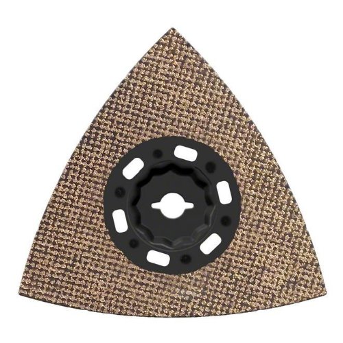 Der Schleifteller Starlock MAVZ 116 RT6 Carbide RIFF bietet besonders hohe Lebensdauer beim Entfernen von Mörtel und Fliesenkleber. Die Platte ist für hohe Verschleißfestigkeit und somit außergewöhnlich lange Nutzungsdauer mit hochwertigem Carbide-Korn der Körnung 60 besetzt. Der offene Besatz ermöglicht aggressiven Materialabtrag ohne Zusetzen oder Ablagerung für eine höhere Lebensdauer des Tellers. Dieser Schleifteller ist ideal geeignet für das Entfernen dicker Farbschichten von Holz und sowie das Raspeln von verwittertem Holzes. Der Schleifteller Starlock MAVZ 116 RT6 Carbide RIFF erreicht dank seiner Größe und der Deltaform auch kleinste Ecken und ist zugleich für große Flächen geeignet. Das System Starlock Max ermöglicht selbst bei härtestem Einsatz maximale Tiefe, Geschwindigkeit und Vielseitigkeit. Das spezielle Starlock-Aufnahmesystem ermöglicht durch seine dreidimensionale enge Passung maximale Kraftübertragung zwischen Maschine und Zubehör.
