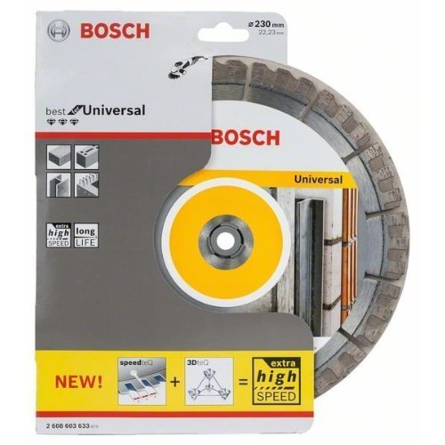 Die Diamanttrennscheibe Best for Universal ermöglicht schnelle Schnitte in allgemeinem Baumaterial. Das spezielle Segmentdesign Speedteq und die Diamantanordnung 3Dteq gewährleisten ausgesprochen schnelles Schneiden. Die optimierte Diamantmatrix ermöglicht sehr schnelle Schnitte und die lasergeschweißten Diamantschneidesegmente mit einer Höhe von 15 mm ermöglichen dank ihrer Robustheit ausgesprochen schnelles Arbeiten. Geeignet zum Schneiden von Beton und Mauerwerk.