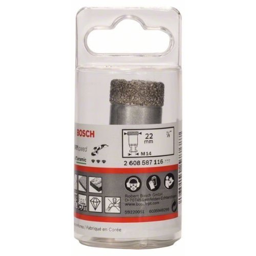Der Diamanttrockenbohrer Dry Speed mit hoher Lebensdauer für das Trockenbohren von Hartkeramik Der hochwertige Diamantbesatz ermöglicht hohe Bohrdrehzahlen und die Vakuumlöttechnologie gewährleistet eine hohe Lebensdauer. Dieses Produkt eignet sich für Fliesen – von weichen Wandfliesen bis zu sehr harten Bodenfliesen aus Steingut.