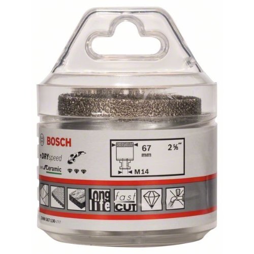 Der Diamanttrockenbohrer Dry Speed mit hoher Lebensdauer für das Trockenbohren von Hartkeramik Der hochwertige Diamantbesatz ermöglicht hohe Bohrdrehzahlen und die Vakuumlöttechnologie gewährleistet eine hohe Lebensdauer. Dieses Produkt eignet sich für Fliesen – von weichen Wandfliesen bis zu sehr harten Bodenfliesen aus Steingut.