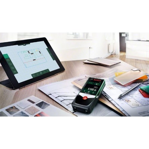 Digitaler Laser-Entfernungsmesser PLR 50 C. Die intelligente Art zu messen. Präzise Messungen bis zu 50 m dank Lasertechnologie. Touchscreen-Bedienung am hochwertigen Farbdisplay für optimale Handhabung und Lesbarkeit. Alle Standardmessfunktionen integriert einschließlich indirekter Messungen. Animierte Schritt-für-Schritt-Anleitung für jede Funktion. Bluetooth-Konnektivität, um die Ergebnisse zur Bosch App zu übertragen. Im Lieferumfang enthalten: Batterien 3 x 1,5-V-LR03 (AAA), Handschlaufe, Schutztasche