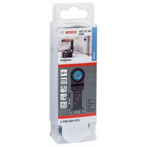 Das Tauchsägeblatt Starlock AIZ 32 AB hat bei Schnitten in ungehärtetem Metall eine hohe Lebensdauer. Die robuste Bimetallverbindung aus Blatt aus HCS-Stahl (Stahl mit hohem Kohlenstoffgehalt) und Zähnen aus HSS-Stahl (Schnellarbeitsstahl) ist bei hartem oder abrasivem Material verschleiß- und hitzeresistent. Sein zur Basis hin verjüngtes Blatt minimiert Verklemmen, transportiert Material schnell ab minimiert somit den Blattverschleiß. Das robuste Aufnahmesystem des AIZ 32 AB reduziert Lateralschwingung und ermöglicht mittels direkter Kraftübertragung präzise Schnitte bei verlängerter Nutzungsdauer. Dieses Produkt wird verwendet für das bündige Ablängen von Nägeln und Kupferrohren sowie Tauchschnitte in Gipskartonplatten. Das Starlock-Aufnahmesystem ermöglicht einen schnellen Blattwechsel ohne Blattberührung in drei Sekunden. Das Aufnahmesystem ermöglicht durch seine dreidimensionale enge Passung maximale Kraftübertragung zwischen Maschine und Zubehör.