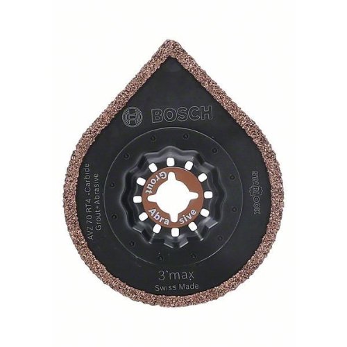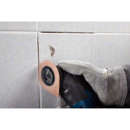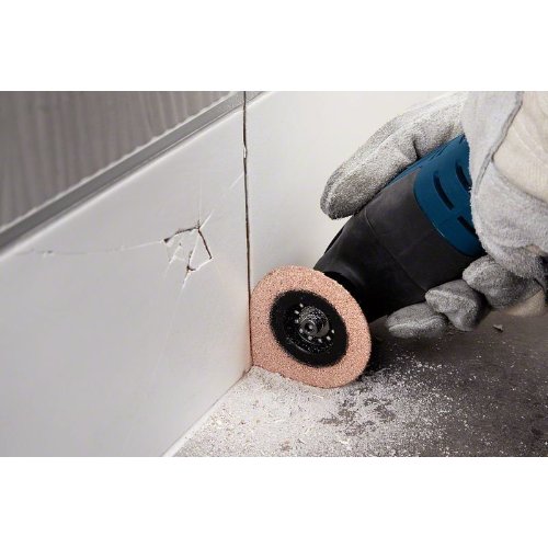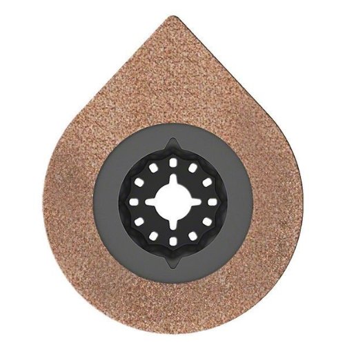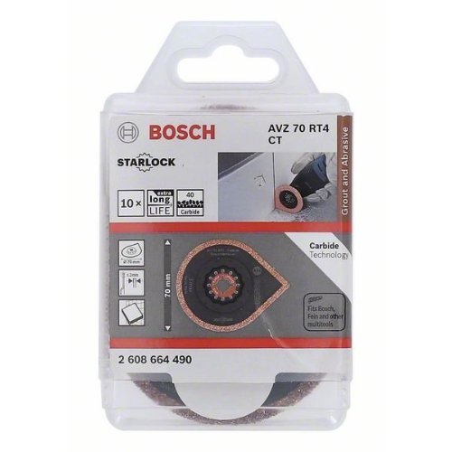 Der Mörtelentferner Starlock AVZ 70 RT4 vereinigt drei Funktionen in einem Teil. Funktion 1: Die hochwertige, mit Carbide-Korn besetzte abgerundete Spitze entfernt mühelos Fugenmörtel und Mörtel aus schwer zugänglichen Ecken. Funktion 2: Die Schneidekante fräst effizient Fliesenfugen aus. Funktion 3: Der Carbide-Kornbesatz entfernt schnell und mühelos Mörtel und Fliesenkleber. Dieses multifunktionale Zubehörteil fräst Fliesenfugen aus und durchsägt Porenbeton sowie weichen Backstein. Mit ihm lassen sich auch Fugen in schwer zugänglichen Ecken ausfräsen sowie Aussparungen in Zementfaserplatten und faserverstärkte Verbundwerkstoffe sägen. Das Starlock-Zubehör ist mit widerstandsfähigem Carbide der Körnung 40 besetzt. Sie sorgt für hohe Verschleißresistenz und folglich bei hervorragender Leistung für eine besonders lange Nutzungsdauer. Das Starlock-Aufnahmesystem ermöglicht einen schnellen Blattwechsel ohne Blattberührung in drei Sekunden. Das Starlock-Aufnahmesystem ermöglicht durch seine dreidimensionale enge Passung maximale Kraftübertragung zwischen Maschine und Zubehör.
