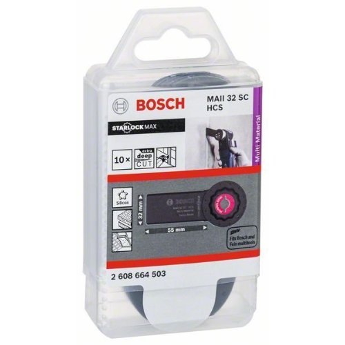 Der Universalfugenschneider Starlock MAII 32 SC ermöglicht effizient Resultate beim Hochleistungsschneiden von weichem Material. Das zweischneidige Blatt ermöglicht Schneiden in widerstandsfähige Oberflächen mit hochfrequenten 20.0000 Schnitten pro Minute. Das Blatt hat eine dünne aber robuste Schneide, die biegefest ist und leistungsstark in biegsames Material eindringt. Das Blatt mit 55 mm Länge ermöglicht tiefe Schnitte in widerstandsfähiges weiches Material. Dieser Schneider ist ausgelegt für weiches Fugenmaterial, widerstandsfähige Dichtfugen an Kanten, tiefe Silikonfugen sowie das Ausschneiden von Fensterkitt und Dichtmasse. Das System Starlock Max ermöglicht selbst bei härtestem Einsatz maximale Schnitttiefe, Geschwindigkeit und Vielseitigkeit. Das Starlock-Aufnahmesystem ermöglicht einen schnellen Blattwechsel ohne Blattberührung in drei Sekunden. Das Starlock-Aufnahmesystem ermöglicht durch seine dreidimensionale enge Passung maximale Kraftübertragung zwischen Maschine und Zubehör.