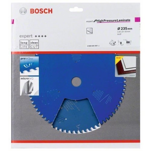 Expert for High Pressure Laminate Kreissägeblatt für das Schneiden von Hochdruck-Schichtpressstoffplatten. Das Blatt ist mit Extra Hard Microteq-Zähnen versehen, die bei Bosch in Eigenproduktion aus hochgradig robustem Carbide-Korn gefertigt werden. Die gute Qualität, die Holzarbeiter erwarten, die Fähigkeit, extreme Bedingungen bei professionellen Konstruktionen zu bewältigen. Die Schutzbeschichtung des Blatts fördert diese hohe Leistung, sie verhindert Korrosion, ermöglicht zuverlässiges Schneiden und reduziert dabei Reibung. Das Produkt ist mit Dämpfungsschlitzen für einen besonders ruhigen Lauf, deutlich weniger Geräusche und spürbar geringere Vibration ausgestattet. Dieses Sägeblatt bei Hochdruck-Schichtpressstoffplatten verwenden. Mit HLTCG-Zähnen (High-Low Triple Chip Ground) ist das Kreissägeblatt Expert for High Pressure Laminate robust auf die Arbeit mit abrasivem Material ausgelegt.