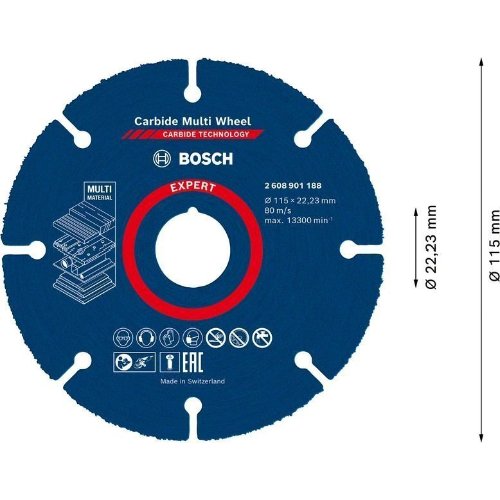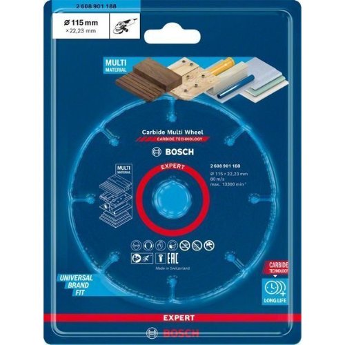 Herausragende Lebensdauer in unterschiedlichen Materialien! Der gleichbleibende Durchmesser hält Schnittgeschwindigkeit und Schnittkapazität konstant hoch. Profis schätzen Winkelschleifer für ihre Fähigkeit, zähe Materialien wie Beton, Stein und Metall zu trennen. Mit dem EXPERT Carbide Multi Wheel kann dieses wunderbare Werkzeug noch vielseitiger eingesetzt werden. Es schneidet effizient alle Arten von weicheren Materialien wie Holz, Kunststoff und moderne Verbundwerkstoffe. Mit dem EXPERT Carbide Multi Wheel wird dein Winkelschleifer noch vielseitiger. Viele Handwerker benötigen möglicherweise nur dieses einzige Elektrowerkzeug. Herausragende Lebensdauer durch Bosch Carbide Technology