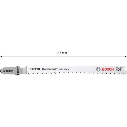 Höchste Präzision für ausrissfreies Schneiden von laminierten Arbeitsplatten! Bi-Metall Blatt: Kombiniert harte Zähne mit flexiblem Blattkörper. Unter Tischlern und Schreinern war es schon immer eine Kunst sicherzustellen, dass der sichtbare Teil des Arbeitsmaterials die „saubere Seite“ eines Stichsägenschnitts zeigt. Manchmal muss man das Werkstück zum Sägen umdrehen oder sägt von der Unterseite, um die gewünschte Schnittqualität auf der Sichtseite zu haben. Oder du verwendest das EXPERT ‘Hardwood 2-side clean’, welches dank seiner Zahngeometrie auf beiden Seiten einen perfekten, ausrissfreien Schnitt bietet. Hergestellt aus Bi-Metall – einer Leiste aus Schnellarbeitsstahl, die auf ein flexibles Stahlblatt geschweisst wird, um Festigkeit und Flexibilität zu kombinieren – ist das Bosch EXPERT 'Hardwood 2-side clean' Stichsägeblatt robust genug um beschichtete Küchenplatten aus Grobspanplatten oder Hartholz zu schneiden. Erhältlich für ausrissfreie gerade Schnitte (T308BF) und für besonders genaue ausrissfreie Winkelschnitte (T308BFP) Ausrissfreie Schnitte mit 2-side Clean Geometry.
