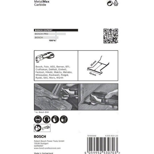 Herausragende Lebensdauer in harten und zähen Metallen! Zusätzliche Beschichtung macht Carbide widerstandsfähiger! Wenn gehärtete Schrauben rosten oder auf andere Weise stecken bleiben, besteht die einzige Option darin, sie flach an der Oberfläche abzuschneiden. Der EXPERT MetalMax macht auch in gehärtetem Metall einen perfekten bündigen Schnitt. Mit seiner herausragenden Langlebigkeit ist es das perfekte Zubehör für Handwerker, die harte Materialien mit einem Multifunktionswerkzeug schneiden möchten. Du hast gesehen, wie mühelos das Multifunktionswerkzeug in und durch Holz sägen kann: Mit dem Bosch EXPERT MetalMax Blatt für Multifunktionswerkzeuge kann Metall genauso zersägt werden. Es sägt sogar mühelos gehärtete Fensterschrauben und Armierungen. Herausragende Lebensdauer durch Bosch Carbide Technology