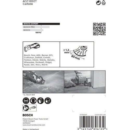Lange Lebensdauer beim Schneiden von abrasivem Material und Verbundwerkstoffen! Dickeres Blatt für zusätzliche Robustheit und Stabilität. Auffälliger Zement hinter einem Türrahmen oder unter einer Diele brachte die Arbeit früher zum Stillstand, da ein teurer Blattwechsel vorgenommen werden musste. Mit dem EXPERT MultiMaterial Segment ist dies nicht mehr notwendig. Das Blatt ist robust genug, um Fugenmörtel und Mörtel sowie Arbeitsplatten mit fester Oberfläche und abrasive Laminate und Verbundwerkstoffe zu schneiden. Es macht einfach weiter. Das Bosch EXPERT MultiMaterial Segment Blatt für Multifunktionswerkzeuge ist ein weiterer Fortschritt in der Bosch Carbide Technology: Zum ersten Mal wurde ein großer gebogener Carbide-Streifen fest mit einem Blatt für Multifunktionswerkzeuge verschweißt. Es bietet die höchste Präzision und Lebensdauer unter den Segmentblättern. Herausragende Lebensdauer durch Bosch Carbide Technology