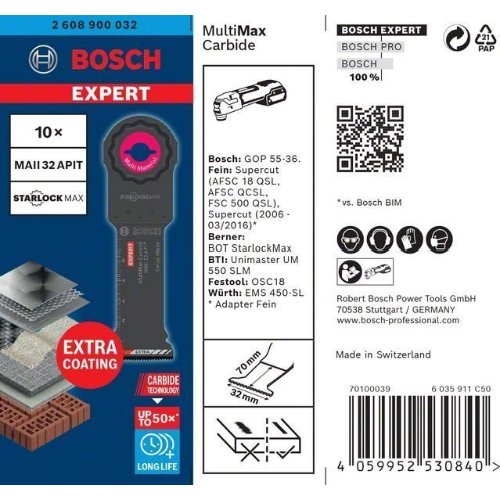 Herausragende Lebensdauer in Bleche und abrasiven Materialien! Zusätzliche Beschichtung macht Carbide widerstandsfähiger! Unabhängig davon, ob du an Gebäuden oder Fahrzeugen arbeitest: Ein Blatt für Multifunktionswerkzeuge, das hervorragende Schnitte in jedes Material ermöglicht, erleichtert das Arbeitsleben erheblich. Das EXPERT MultiMax integriert alle fortschrittlichsten Fertigungstechniken von Bosch und macht dein Multifunktionswerkzeug extrem vielseitig. Die Curved-Tec-Blätter von Bosch überzeugen dank ihrer Fähigkeit, saubere Tauchschnitte und schwierige Schnitte auf hohem Niveau zu ermöglichen. Mit dem Bosch EXPERT MultiMax Blatt für Multifunktionswerkzeuge kannst du diese Fähigkeit für Tauchschnitte auf die härtesten Materialien wie Blech, Kohlefaser und roten Backstein übertragen. Herausragende Lebensdauer durch Bosch Carbide Technology