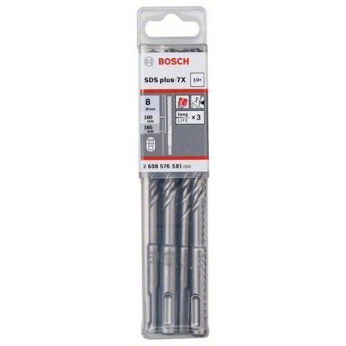 Der SDS plus-7X Bohrer bietet eine hervorragende Nutzungsdauer beim Bohren in armierten Beton. Sein 4-Schneider-Vollkopf besteht aus höchstqualitativem Carbide, wodurch der Kopf verstärkt wird und eine außergewöhnliche Schlagfestigkeit entsteht. Seine durchgängige Verteilung der Bohrkraft garantiert, dass kein Leistungsverlust auftritt, womit die Gesamtlebensdauer erhöht wird. Die einzigartige Diffusionsschweißtechnologie (IDS) von Bosch bietet starken Halt zwischen Kopf und Hals. Darüber hinaus reduziert das 4-spiralige Design mit breiten Kanälen den Verschleiß am Bohrer, indem ein effektiver Bohrmehlabtransport gewährleistet wird. Dieser Bohrer ist für den Einsatz für Bohrhämmer in Mauerwerk, Beton und armierten Beton vorgesehen. Um präzise Ergebnisse zu erzielen, ist anhand der Verschleißkennzeichnung zu erkennen, ob der Lochdurchmesser noch innerhalb der Toleranz für die Dübel liegt. Als Qualitätsbeleg trägt der Bohrer das Qualitätstestzeichen von PGM Masonry Drill Bit Association Board, das Konformität mit strengen Toleranzen, präzises Bohren und einen festen Halt der Befestigungsmaterialien garantiert. Er wird in Deutschland hergestellt.