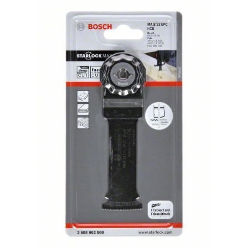 Das Tauchsägeblatt Starlock MAIZ 32 EPC ermöglicht besonders tiefe Schnitte in Holz. Seine Länge von 80 mm erhöht die Reichweite für ausgedehnte Schnitte. Die direkte Kraftübertragung und das robuste Starlock-Aufnahmesystem reduzieren Lateralschwingung und ermöglichen längere präzise Schnitte. Mit diesen robusten Merkmalen ist dieses Produkt ideal geeignet für tiefe Tauchschnitte in Holz und Holzbalken sowie zum Anfertigungen von Aussparungen für Zapfen und Verbindungen. Das Blatt durchschneidet auch massives Weichholz. Eine abgerundete Blattspitze (Curved-Tec) ermöglicht präzise und glatte Tauchschnitte. Das System Starlock Max ermöglicht selbst bei härtestem Einsatz maximale Schnitttiefe, Geschwindigkeit und Vielseitigkeit. Zusätzlich ermöglicht das Starlock-Aufnahmesystem schnellen Blattwechsel in drei Sekunden ohne Blattberührung. Das spezielle Starlock-Aufnahmesystem ermöglicht durch seine dreidimensionale enge Passung maximale Kraftübertragung zwischen Maschine und Zubehör.