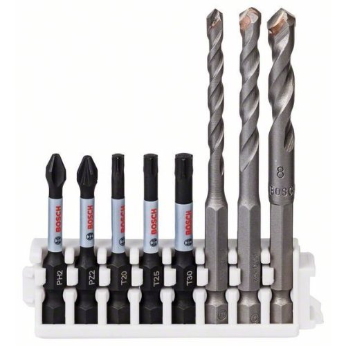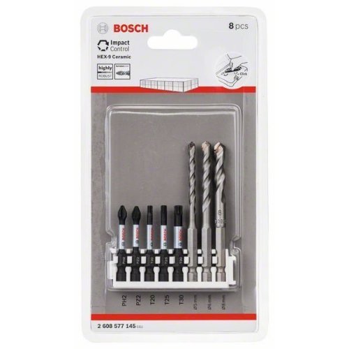 Das Impact Control Schrauberbitset ist sehr robust und ideal für den Schwereinsatz. Das Bit besitzt eine spezielle Torsionszone, die ihm extreme Haltbarkeit bei Dauerbelastung verleiht, sodass es selbst dem großen Drehmoment von Schlagschraubern standhält. S2-modifizierter Stahl und optimierter Wärmebehandlungsprozess verleihen höchste Haltbarkeit für Bestleistungen bei umfangreichen Montagen und Industriearbeiten. Der HEX-9 Ceramic Fliesenbohrer dient zum schnellen Bohren in Fliesen. Die 7-seitigen asymmetrisch diamantgeschliffenen Schneidekanten ermöglichen einen schnellen Bohrfortschritt. Die zweispiralige U-Form fördert effektiven Bohrmehlabtransport, der Bohrer arbeitet sich besser durch das Material und die Arbeit geht schneller voran. Die Bits sind Teil des Systems Bosch Pick and Click, das individuell zusammenstellbare Zubehörsets für absolut flexible Bit-Sortimente ermöglicht. Einrasteinschübe sichern einzeln gekaufte Bitpacks individueller Sortimente für individuelle Sammlungen und ermöglichen das einfache Ersetzen alter Bitpacks. Die Bits werden in einem Kunststoffhalter geliefert, der in die Leerboxen Pick and Click M und L einrastet und individuell zusammengestellte Bitsets ermöglicht.