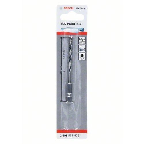 Der HSS-Spiralbohrer PointTeQ mit Sechskantschaft liefert schnelle Ergebnisse beim Bohren in Metall. Der für Hochgeschwindigkeitsbohrungen entwickelte Bohrer erzeugt minimale Wärme und macht den Bohrer verschleißfest. Das PointTeQ-Design an der Bohrspitze sorgt für kontinuierliche Schärfe und hohe Langlebigkeit. Die selbstzentrierende Spitze verhindert Wandern und ermöglicht schnelles und einfaches Anbohren. Die mit Schwarzoxid beschichtete Bohrspirale ermöglicht ein schnelles Abtragen der Späne. Für eine noch höhere Zuverlässigkeit bietet der Sechskantschaft des Bohrers Stabilität und eine feste Verbindung zwischen Bohrer und Futter. Der Körper des Bohrers wird gestärkt und es besteht ein niedrigeres Bruchrisiko für Bohrer mit einem Durchmesser von weniger als 6 mm. Die Bohrspitze des HSS-Spiralbohrers PointTeQ mit Kreuzanschliff ermöglicht perfektes Zentrieren. Bohrer, Typ N (kleiner Seitenspanwinkel) mit 135°-Design, gemäß DIN 338 hergestellt.