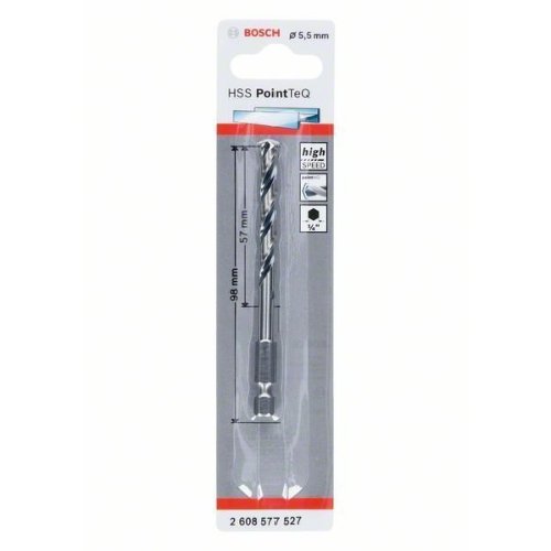 Der HSS-Spiralbohrer PointTeQ mit Sechskantschaft liefert schnelle Ergebnisse beim Bohren in Metall. Der für Hochgeschwindigkeitsbohrungen entwickelte Bohrer erzeugt minimale Wärme und macht den Bohrer verschleißfest. Das PointTeQ-Design an der Bohrspitze sorgt für kontinuierliche Schärfe und hohe Langlebigkeit. Die selbstzentrierende Spitze verhindert Wandern und ermöglicht schnelles und einfaches Anbohren. Die mit Schwarzoxid beschichtete Bohrspirale ermöglicht ein schnelles Abtragen der Späne. Für eine noch höhere Zuverlässigkeit bietet der Sechskantschaft des Bohrers Stabilität und eine feste Verbindung zwischen Bohrer und Futter. Der Körper des Bohrers wird gestärkt und es besteht ein niedrigeres Bruchrisiko für Bohrer mit einem Durchmesser von weniger als 6 mm. Die Bohrspitze des HSS-Spiralbohrers PointTeQ mit Kreuzanschliff ermöglicht perfektes Zentrieren. Bohrer, Typ N (kleiner Seitenspanwinkel) mit 135°-Design, gemäß DIN 338 hergestellt.