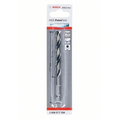Der HSS-Spiralbohrer PointTeQ mit Sechskantschaft liefert schnelle Ergebnisse beim Bohren in Metall. Der für Hochgeschwindigkeitsbohrungen entwickelte Bohrer erzeugt minimale Wärme und macht den Bohrer verschleißfest. Das PointTeQ-Design an der Bohrspitze sorgt für kontinuierliche Schärfe und hohe Langlebigkeit. Die selbstzentrierende Spitze verhindert Wandern und ermöglicht schnelles und einfaches Anbohren. Die mit Schwarzoxid beschichtete Bohrspirale ermöglicht ein schnelles Abtragen der Späne. Für eine noch höhere Zuverlässigkeit bietet der Sechskantschaft des Bohrers Stabilität und eine feste Verbindung zwischen Bohrer und Futter. Der Körper des Bohrers wird gestärkt und es besteht ein niedrigeres Bruchrisiko für Bohrer mit einem Durchmesser von weniger als 6 mm. Die Bohrspitze des HSS-Spiralbohrers PointTeQ mit Kreuzanschliff ermöglicht perfektes Zentrieren. Bohrer, Typ N (kleiner Seitenspanwinkel) mit 135°-Design, gemäß DIN 338 hergestellt.