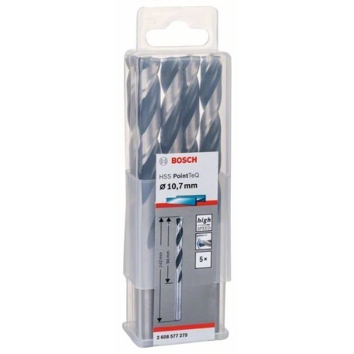 Der HSS-Spiralbohrer PointTeQ ermöglicht schnelles Bohren in Metall aufgrund des PointTeQ-Designs an der Bohrspitze. Schnelles und einfaches Anbohren ist möglich, da die selbstzentrierende Spitze Wandern verhindert. Aufgrund der erhöhten Bohrrate werden weniger Hitze und Verschleiß erzeugt. Das PointTeQ-Design an der Bohrspitze bleibt scharf und hält Dauereinsatz stand. Dieser Bohrer ist zum Bohren von Durchgangs- und Zentrierlöcher in legierten und unlegierten Stahl, in Nichteisenmetalle, Gussstahl, Gusseisen und Kunststoff. Es besteht ein niedriges Bruchrisiko, besonders für Bohrer mit einem Durchmesser unter 6 mm, da der Bohrer so hergestellt wurde, dass er einen hochelastischen Körper hat. Die mit Schwarzoxid beschichtete Nut ermöglicht eine schnelle Entfernung der Späne. Der HSS-Spiralbohrer PointTeQ ist gemäß DIN 338 hergestellt. Der Bohrer ist Typ N (kleiner Seitenspanwinkel) mit einem Spitzenwinkel von 135 Grad.