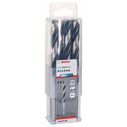Der HSS-Spiralbohrer PointTeQ ermöglicht schnelles Bohren in Metall aufgrund des PointTeQ-Designs an der Bohrspitze. Schnelles und einfaches Anbohren ist möglich, da die selbstzentrierende Spitze Wandern verhindert. Aufgrund der erhöhten Bohrrate werden weniger Hitze und Verschleiß erzeugt. Das PointTeQ-Design an der Bohrspitze bleibt scharf und hält Dauereinsatz stand. Dieser Bohrer ist zum Bohren von Durchgangs- und Zentrierlöcher in legierten und unlegierten Stahl, in Nichteisenmetalle, Gussstahl, Gusseisen und Kunststoff. Es besteht ein niedriges Bruchrisiko, besonders für Bohrer mit einem Durchmesser unter 6 mm, da der Bohrer so hergestellt wurde, dass er einen hochelastischen Körper hat. Die mit Schwarzoxid beschichtete Nut ermöglicht eine schnelle Entfernung der Späne. Der HSS-Spiralbohrer PointTeQ ist gemäß DIN 338 hergestellt. Der Bohrer ist Typ N (kleiner Seitenspanwinkel) mit einem Spitzenwinkel von 135 Grad.