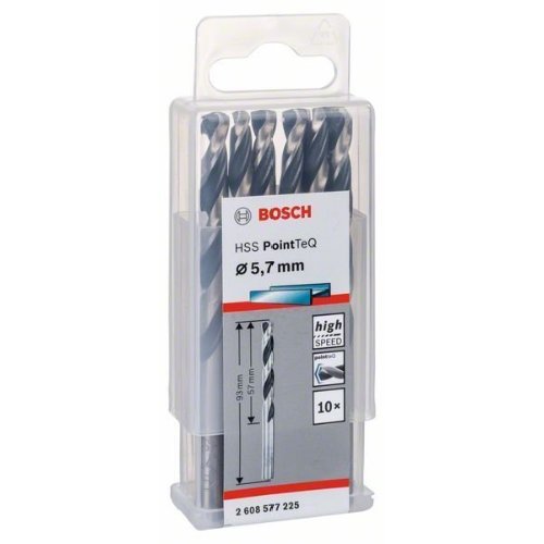 Der HSS-Spiralbohrer PointTeQ ermöglicht schnelles Bohren in Metall aufgrund des PointTeQ-Designs an der Bohrspitze. Schnelles und einfaches Anbohren ist möglich, da die selbstzentrierende Spitze Wandern verhindert. Aufgrund der erhöhten Bohrrate werden weniger Hitze und Verschleiß erzeugt. Das PointTeQ-Design an der Bohrspitze bleibt scharf und hält Dauereinsatz stand. Dieser Bohrer ist zum Bohren von Durchgangs- und Zentrierlöcher in legierten und unlegierten Stahl, in Nichteisenmetalle, Gussstahl, Gusseisen und Kunststoff. Es besteht ein niedriges Bruchrisiko, besonders für Bohrer mit einem Durchmesser unter 6 mm, da der Bohrer so hergestellt wurde, dass er einen hochelastischen Körper hat. Die mit Schwarzoxid beschichtete Nut ermöglicht eine schnelle Entfernung der Späne. Der HSS-Spiralbohrer PointTeQ ist gemäß DIN 338 hergestellt. Der Bohrer ist Typ N (kleiner Seitenspanwinkel) mit einem Spitzenwinkel von 135 Grad.