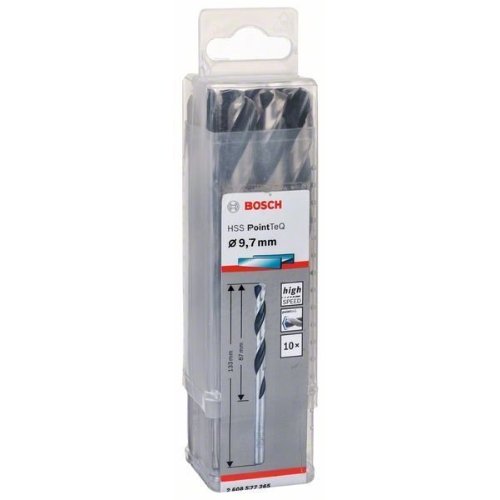 Der HSS-Spiralbohrer PointTeQ ermöglicht schnelles Bohren in Metall aufgrund des PointTeQ-Designs an der Bohrspitze. Schnelles und einfaches Anbohren ist möglich, da die selbstzentrierende Spitze Wandern verhindert. Aufgrund der erhöhten Bohrrate werden weniger Hitze und Verschleiß erzeugt. Das PointTeQ-Design an der Bohrspitze bleibt scharf und hält Dauereinsatz stand. Dieser Bohrer ist zum Bohren von Durchgangs- und Zentrierlöcher in legierten und unlegierten Stahl, in Nichteisenmetalle, Gussstahl, Gusseisen und Kunststoff. Es besteht ein niedriges Bruchrisiko, besonders für Bohrer mit einem Durchmesser unter 6 mm, da der Bohrer so hergestellt wurde, dass er einen hochelastischen Körper hat. Die mit Schwarzoxid beschichtete Nut ermöglicht eine schnelle Entfernung der Späne. Der HSS-Spiralbohrer PointTeQ ist gemäß DIN 338 hergestellt. Der Bohrer ist Typ N (kleiner Seitenspanwinkel) mit einem Spitzenwinkel von 135 Grad.